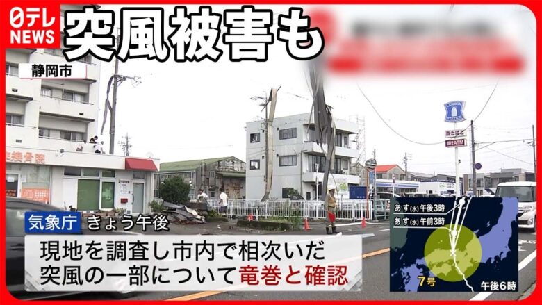 | 静岡地方気象台は「竜巻と認められる」風速は40mと推定 屋根が飛び窓ガラスが割れ…被害の状況は 静岡市 …ごした』西尾梓アナウンサー(静岡・駿河区 正午ごろ):「きのう竜巻とみられる突風被害のあった現場です。きょうも現場は雨が降っています。後ろにあります… (出典:静岡朝日テレビ) |