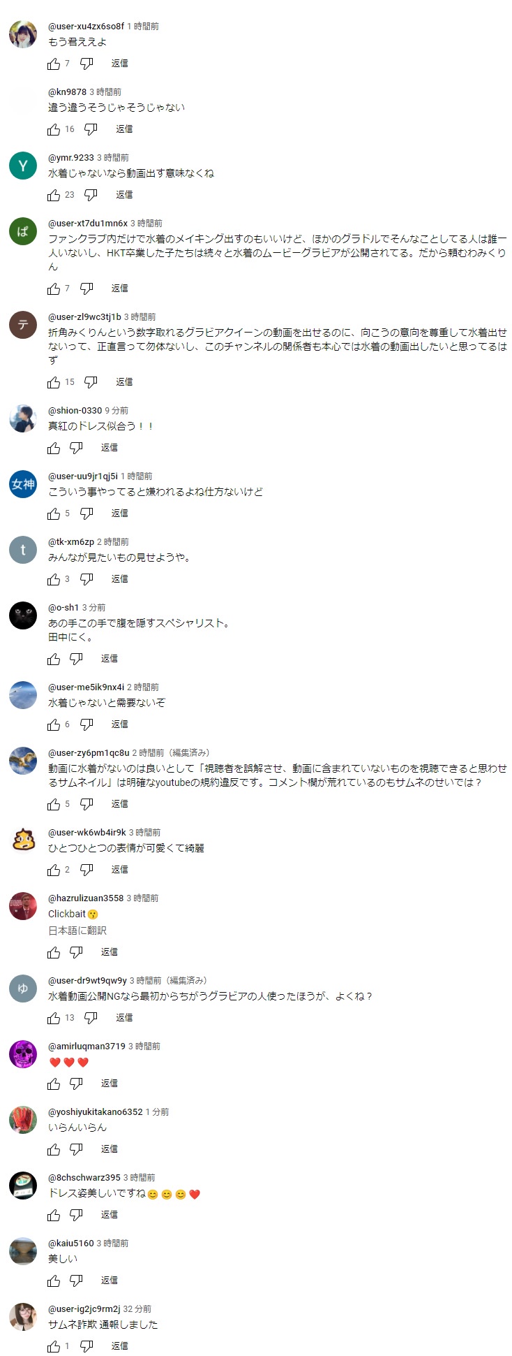 水着サムネで中身は水着無いというチャンネル運営者に対する不満とファンクラブだけで水着公開する田中のやり方両方に批判が集まってる