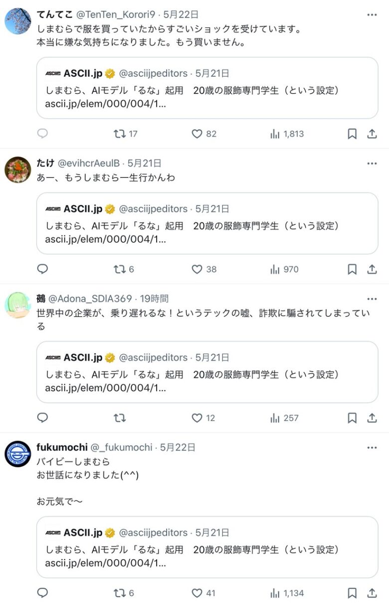 一部の反AIが騒いでるだけやからなあしまむらユーザーレベルで言えば無風か好意的やからなあ