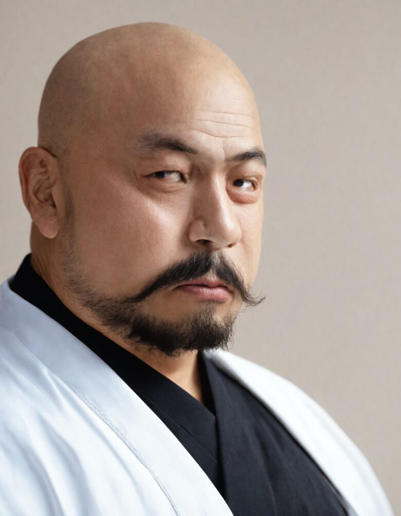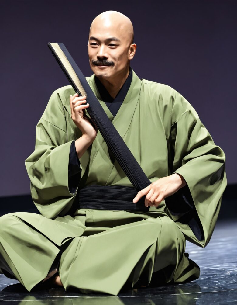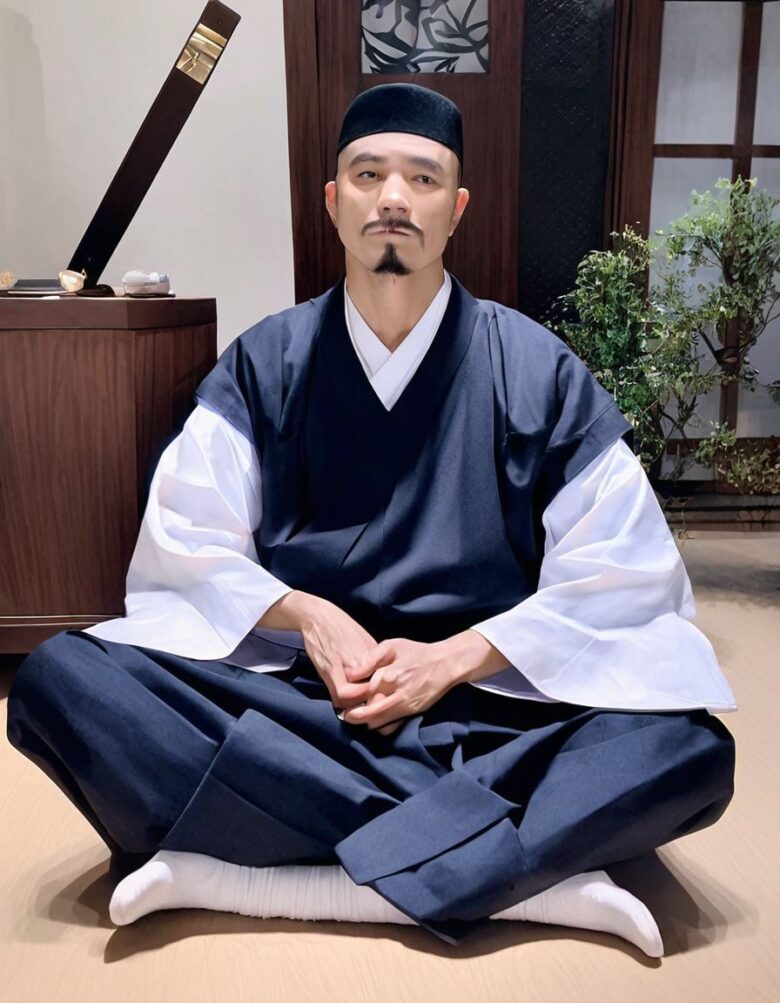 solo, 1boy, sitting, japanese clothes, topknot, black hair, full body, katana, hat, long sleeves, closed mouth, japanese clothes, facial hair, samurai, brown theme, short hair, tabi, sheath, looking to the side, haori, tate eboshi, seiza, single hair bun, black eyes, white socks, wide sleeves, orange kimono, asian, sheathed, hair bun, sash, hanbok, brown kimono, expressionless, unmoving pattern, black headwear, hand fan, half-closed eyes, updo, hair ornament, goatee, holding weapon, looking at viewer, scar, closed eyes, holding sword, hakama skirt, indoors, crossed legs, hanfu, robe