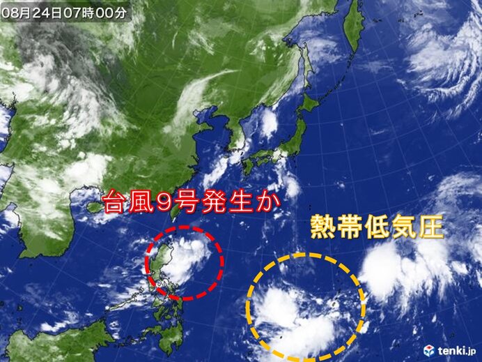 @wni_jp【複数の台風発生予想】 8月24日(木)9時現在、マリアナ諸島の熱帯低気圧について、気象庁は「24時間以内に台風に発達する見込み」と発表。フィリピンの東の熱帯低気圧についても台風に発達する見込みとしています。 次に発生すると「台風9号」続いて発生すると「台風10号」 weathernews.jp/s/topics/20230… pic.twitter.com/H5Z9TdByXn
