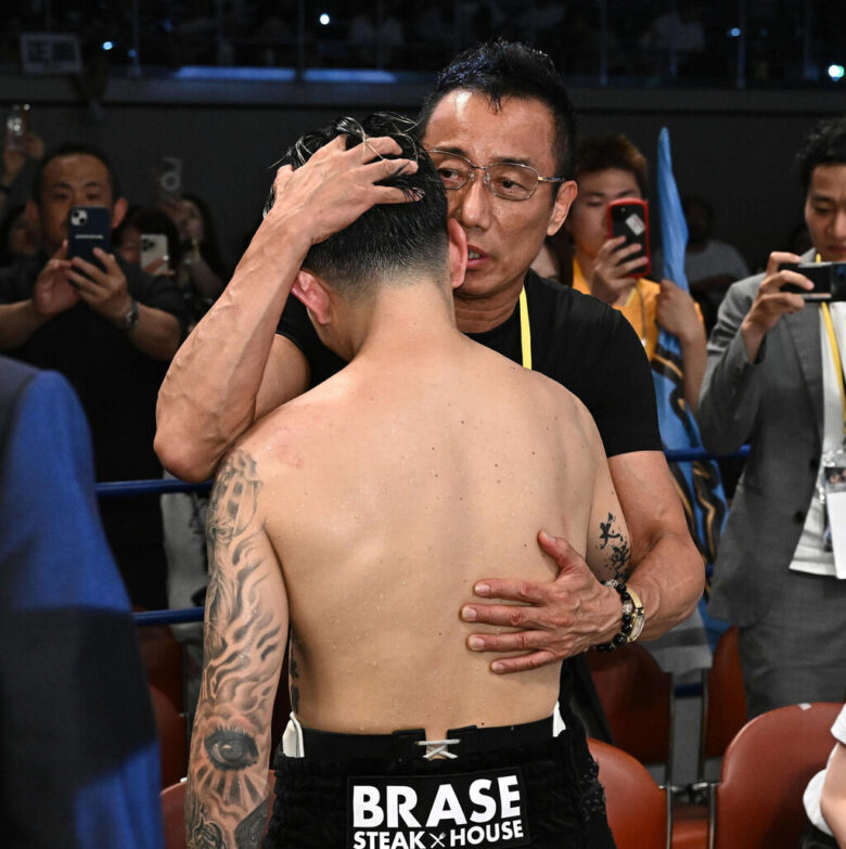 試合後、マルティネスに敗れた井岡(手前)を抱き締める長渕剛