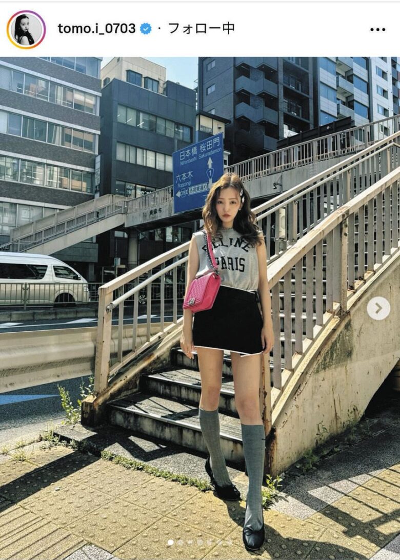 板野は、歩道橋の階段の下でポーズをとった写真を公開。板野いわく流行のミニスカート、バレエシューズをはき、高級ブランド・miumiuのソックスを合わせて《SSトレンドコーデしてみた》とつぶやいた。