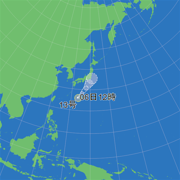 @1YZcl90nnJXw8Jb台風第13号(経路) 9月06日15時45分/気象庁発表 06日15時の実況…南大東島の東約320km 07日03時の予報…日本の南 07日15時の予報…八丈島の南西約220km 08日15時の予報…館山市の東南東約40km 09日15時の予報…東北地方(中心気圧1000 hPa) 10日15時の予報…日本の東(熱帯低気圧)