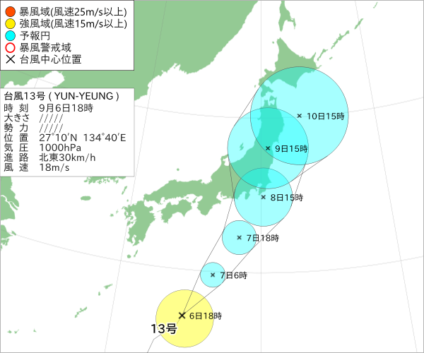 @YukkuriTrain【台風情報】 台風第13号(インニョン)は、日本の南を1時間におよそ30キロの速さで北東へ進んでいます。 <予報> 12時間後の7日6時には、日本の南を中心とする半径85キロの円内に達する見込みです。 中心の気圧は998ヘクトパスカル… pic.twitter.com/qZDeOIeqhk