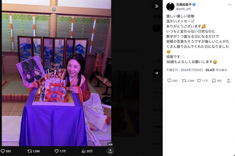 NHK大河ドラマ『光る君へ』で紫式部/まひろ役を演じている吉高由里子が7月23日に公式X(旧Twitter)を更新し、誕生日を祝ってもらったことを報告した。