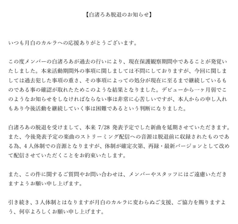 【白渚ろあ 脱退のお知らせ】 pic.twitter.com/oBH7M7FsDx