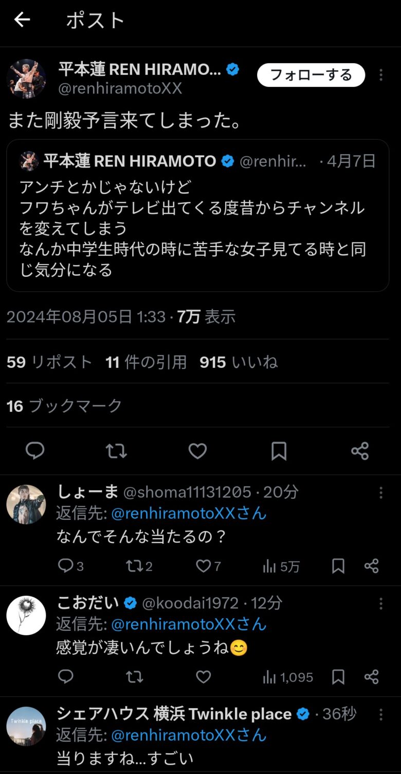 なんか中学生時代の時に苦手な女子見てる時と同じ気分になる— 平本蓮 REN HIRAMOTO (@renhiramotoXX) April 7, 2024