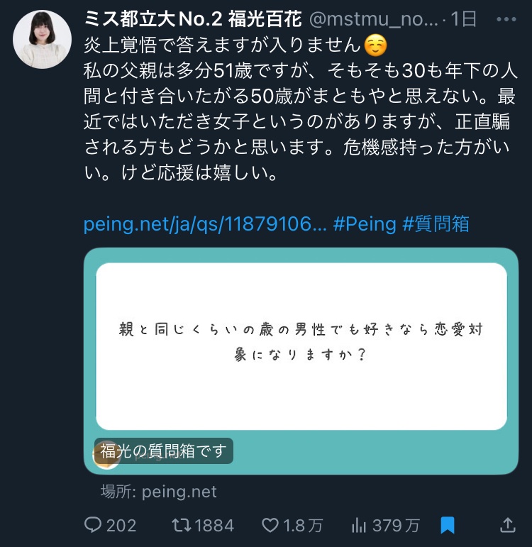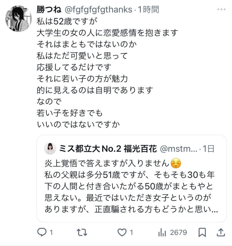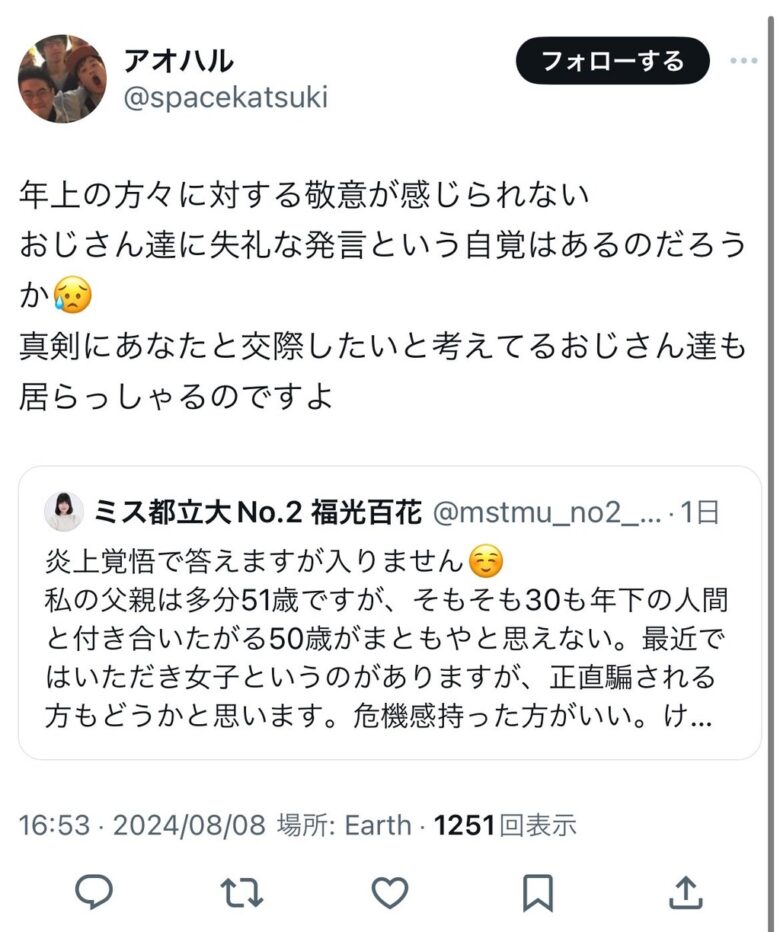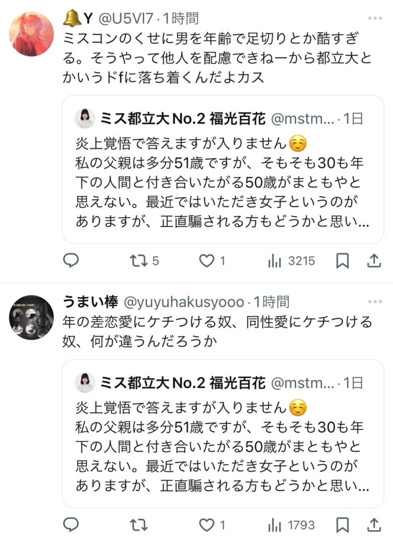 また、これは自分の意見であって、一般化しているわけではありません。#ミスコン #都立大 pic.twitter.com/GS022YpnRH— ミス都立大No.2 福光百花 (@mstmu_no2_2024) August 8, 2024