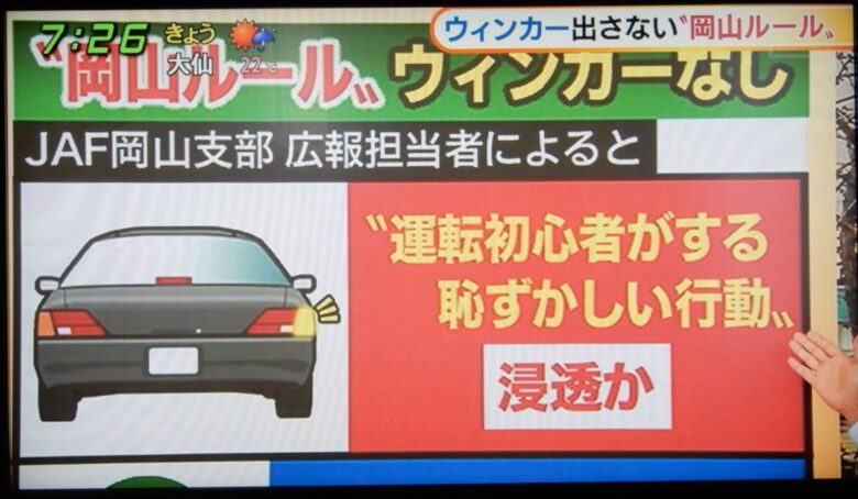 JAF(日本自動車連盟)が、2016年に実施したアンケート調査(全国6万4677人が回答、うち岡山県内在住者970人)で「方向指示器(ウインカー)を出さずに車線変更や右左折する車が多い」という設問に、岡山県では53.2%が「とても思う」と回答している。全国平均は29.4%で、岡山県が全国で最も割合が高かった。