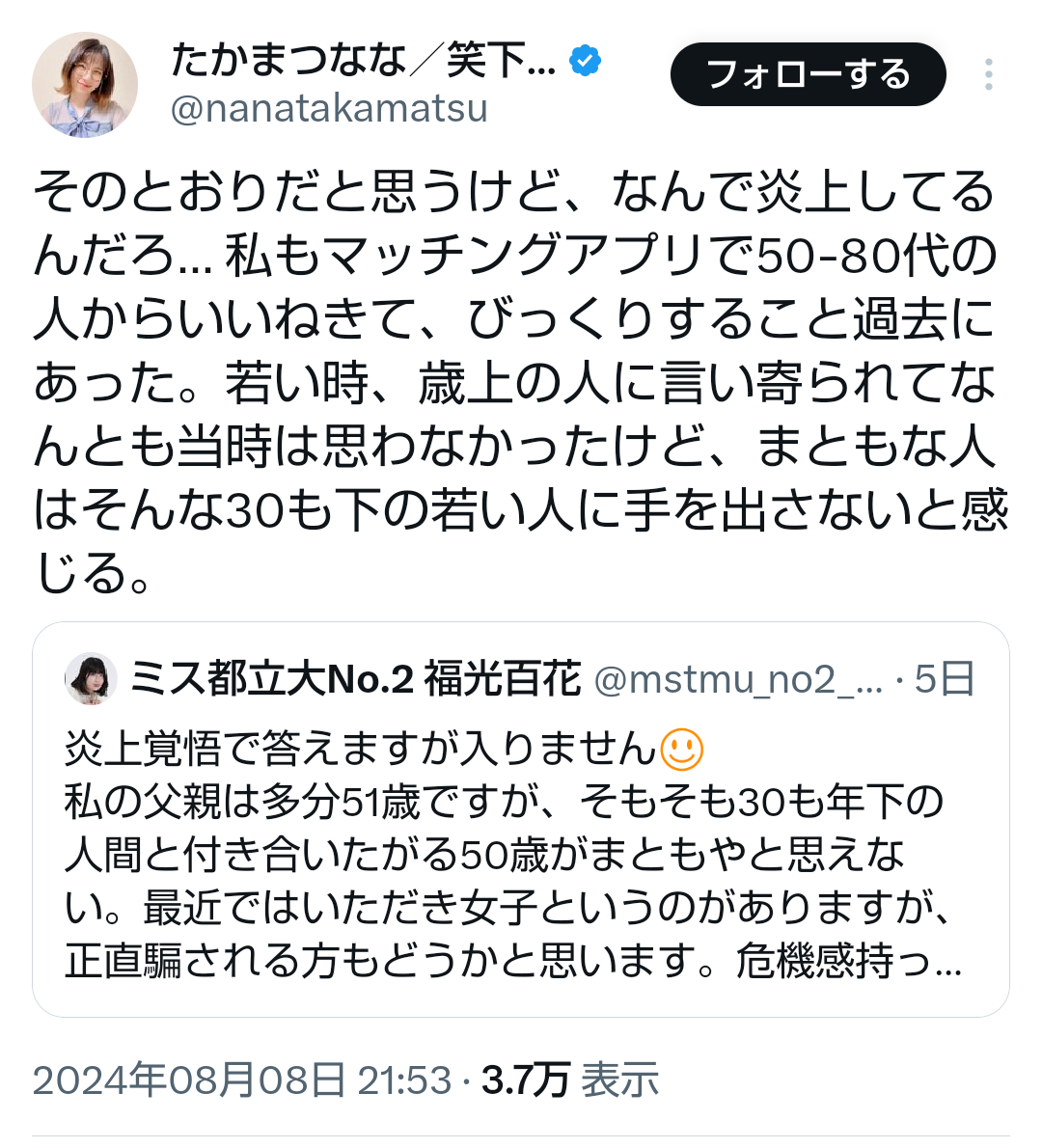 そのとおりだと思うけど、なんで炎上してるんだろ... 私もマッチングアプリで50-80代の人からいいねきて、びっくりすること過去にあった。若い時、歳上の人に言い寄られてなんとも当時は思わなかったけど、まともな人はそんな30も下の若い人に手を出さないと感じる。 https://t.co/VGvjk0LYuz