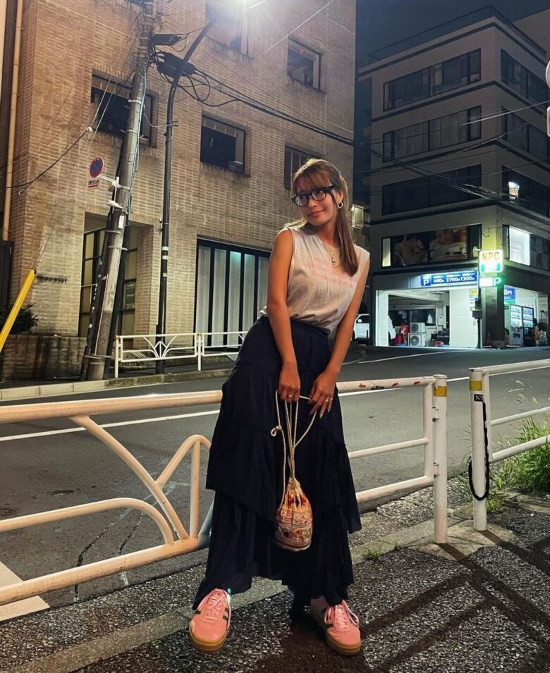 「ピンクのadidasかわいい あと、最近のお気に入りは この @mardi_mercredi_official mardiのパンツ。めっちゃ楽ちん」とつづり、ピンクに緑の3本線が入ったスニーカーをアピールした写真を複数アップした。