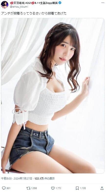 人気アイドルグループ「#2i2(ニーニ)」の天羽希純(あまう・きすみ)さん(27)が2024年7月27日、露出度の高い服装をめぐる「アンチ」がいることをXで明かした。