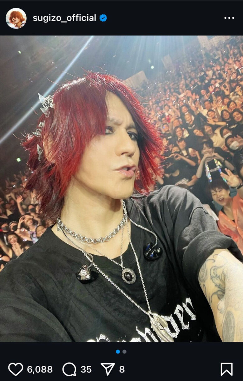 SUGIZOは「From Hiroshima with Love 0811.(広島より愛を込めて)」と書き出し、LUNA SEAの35周年記念ツアーの広島公演に2日目について「大好きな正真正銘第2の故郷広島公演、本当に素晴らしかった! みんな本当にありがとう!」と感謝を記し、客席をバックに記念ショットを公開した。