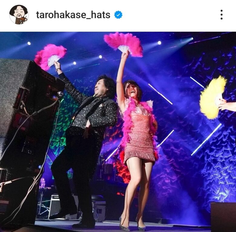 超ミニ衣装で踊る妻の高田万由子(右)。葉加瀬太郎のインスタグラム(@tarohakase_hats)より