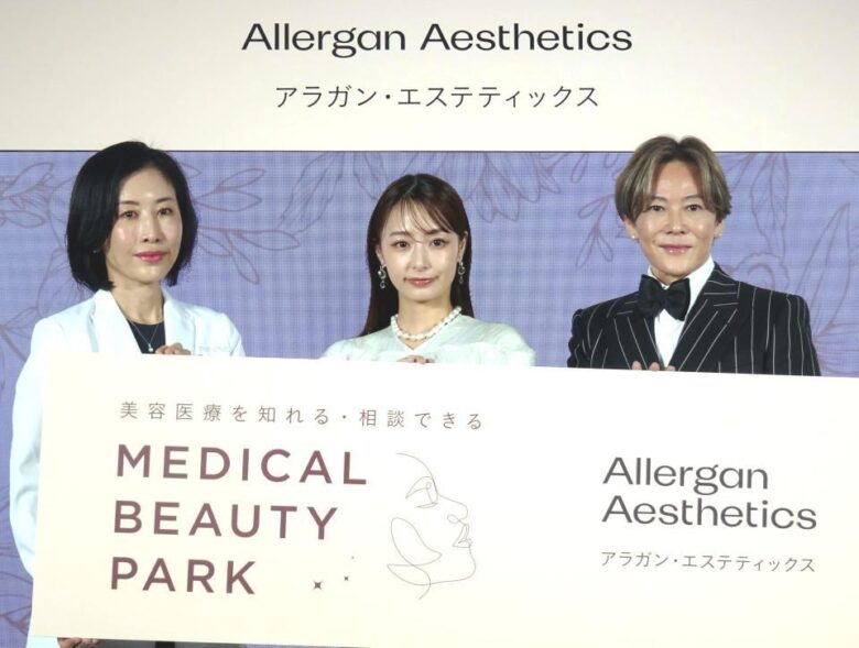 「MEDICAL BEAUTY PARK」記者発表会に出席した宇垣美里アナウンサー(中央)とファッションプロデューサーの植松晃士氏(右)