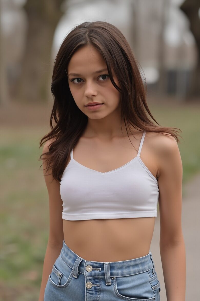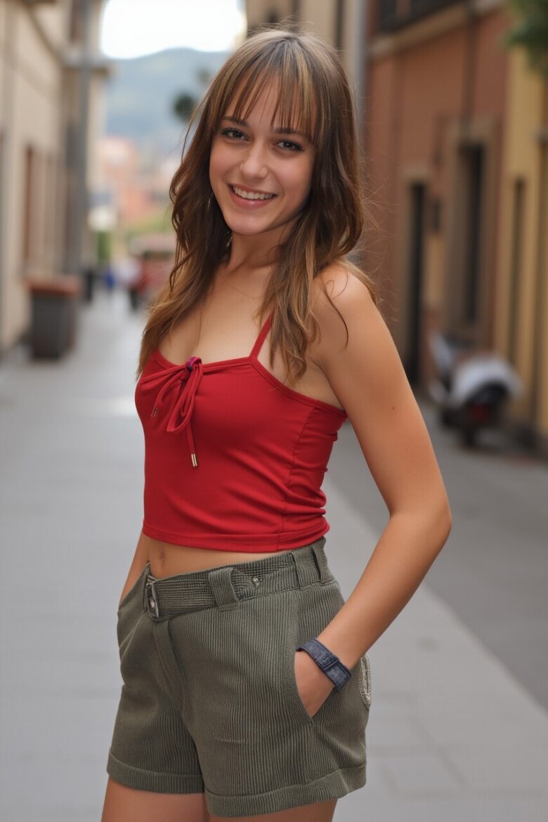 A photograph of a sexy American girl standing outdoors in American attire in an American setting.