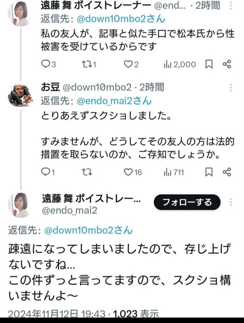 アイドルグループ・アイドリング!!!の元リーダーで、現在はボイストレーナーの遠藤舞さんが12日、自身のX(旧ツイッター)を更新。芸能界の性加害問題について言及する中で、「直の友人が松本氏らからホテルで性被害を受けています」と投稿した。