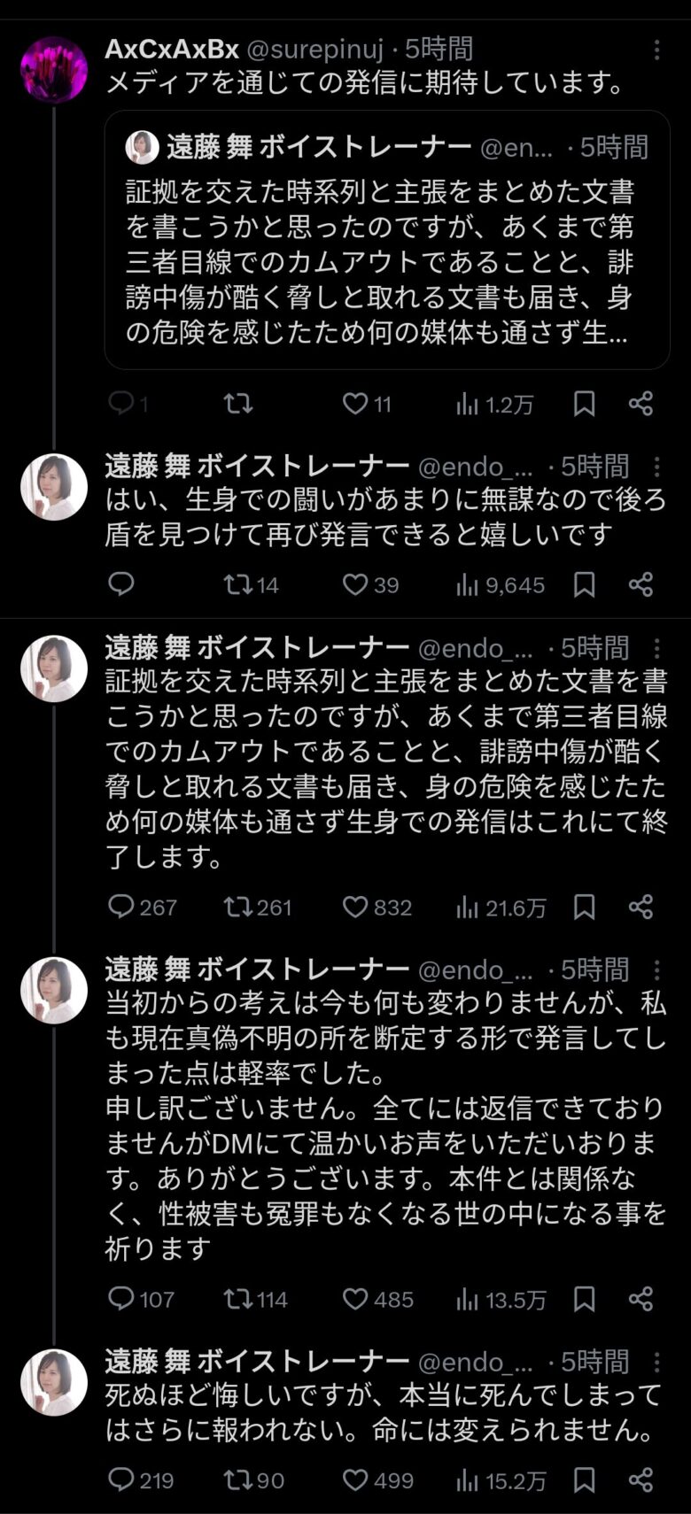 証拠を交えた時系列と主張をまとめた文書を書こうかと思ったのですが、あくまで第三者目線でのカムアウトであることと、誹謗中傷が酷く脅しと取れる文書も届き、身の危険を感じたため何の媒体も通さず生身での発信はこれにて終了します。