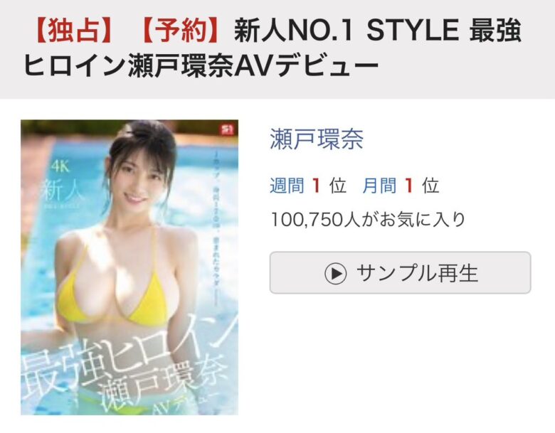 瀬戸 環奈(せと かんな、2004年〈平成16年〉5月10日 - )は、日本のAV女優。元グラビアアイドル。Bstar所属。神奈川県出身。 2024年10月7日、総合週刊誌『週刊ポスト』10月18・25日号(小学館)にて水着姿を披露し、グラビアデビュー。グラビア挑戦のきっかけは、「何か新しいことに… 9キロバイト (1,070 語) - 2025年1月5日 (日) 12:36 |