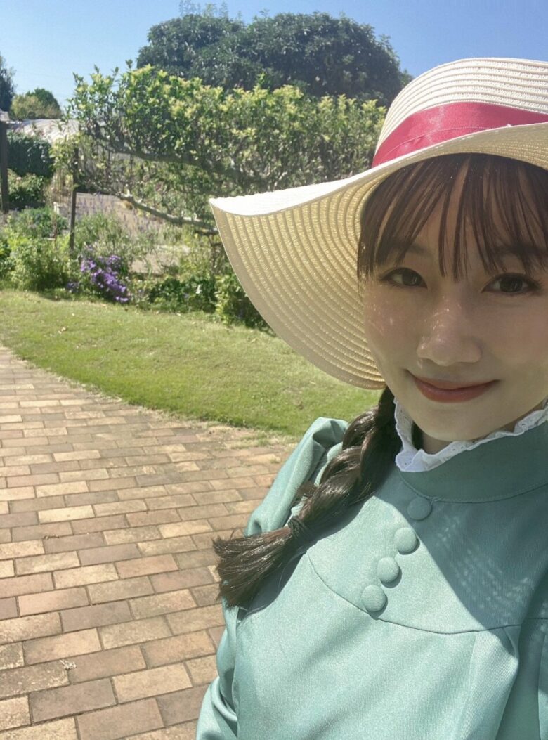 「はい、、、#ハウルの動く城」というコメントとともに、写真をアップ。ソフィーを思わせる緑のワンピース×麦わら帽子姿で、髪は三つ編みに。再現度の高いコスプレ姿となっている。
