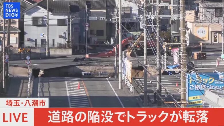 何も知らない自転車のオジサンが、陥没の穴のすぐ横の道路を横断