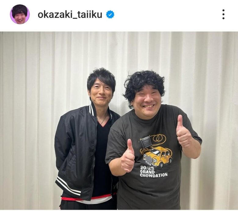 岡崎は「桜井和寿さんと!」と記して2ショットをアップ。桜井はスポーティーなジャケット姿でニッコリ。隣の岡崎は両手でサムズアップを決め、うれしそうに笑った。