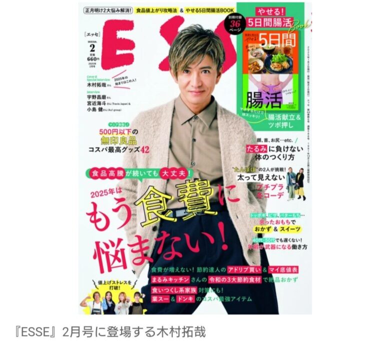 歌手で俳優の木村拓哉が、来年1月4日発売の雑誌『ESSE』(扶桑社)2月号の表紙に2年ぶりに登場する。このほど、木村のカットとスペシャルインタビューの一部抜粋が先行で公開された。