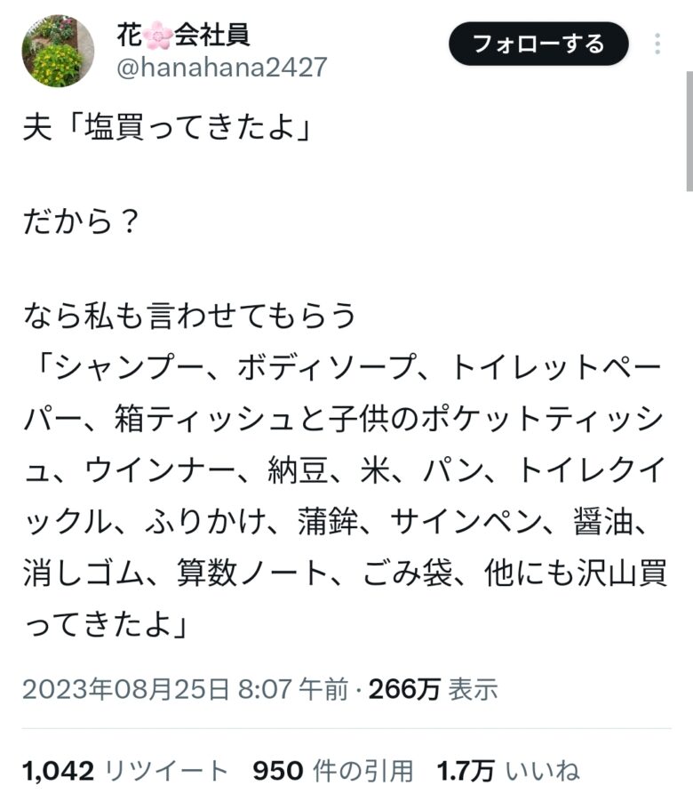 夫「塩買ってきたよ」