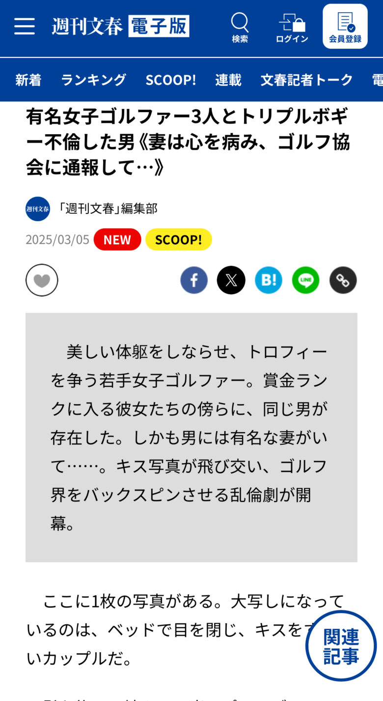 週刊文春電子版が【有名女子ゴルファー3人とトリプルボギー不倫した男《妻は心を病み、ゴルフ協会に通報して…》】と題した記事を配信。プロゴルファーを妻に持つ男性キャディーが、ツアー優勝経験者を含む3人の若手女子プロと不倫関係にあったことを実名で報じたのだ。