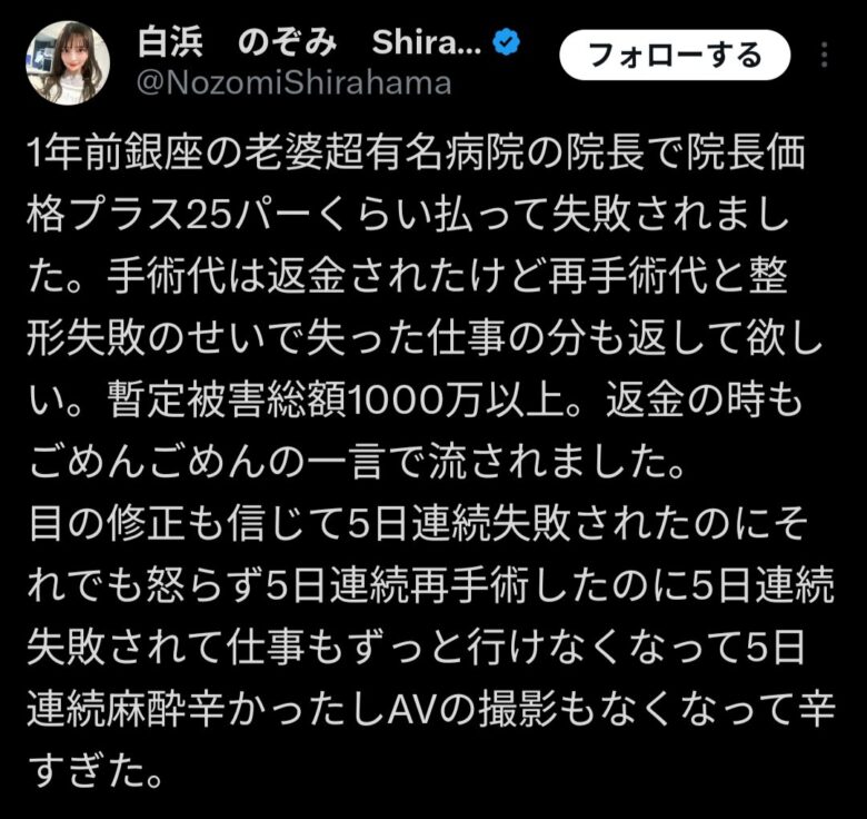 AV女優・白浜のぞみが整形手術に失敗し、仕事を失ったとSNSで告白。銀座の有名クリニックでの施術後、目が三重になり、5日連続で再手術するも改善せず。被害総額は1000万円超え、美容整形のリスクが改めて浮き彫りに。