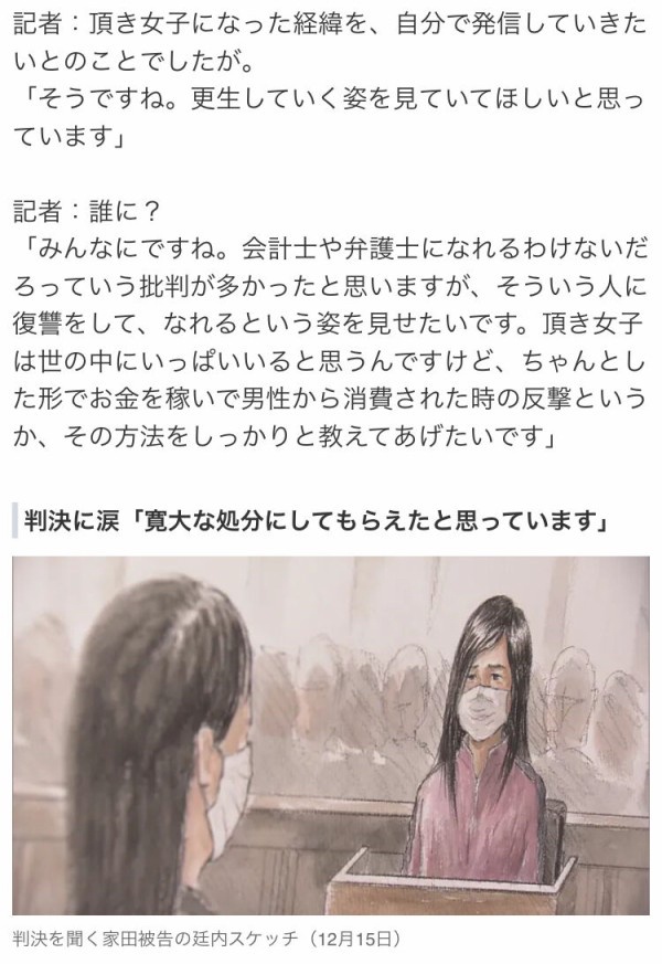 2023年10月、渡辺真衣(25歳)が詐欺で逮捕された。渡辺は「頂き女子りりちゃん」を名乗ってSNSに出没し、パパ活の相手を騙しお金を巻き上げる心得を記した「1カ月1000万頂く頂き女子りりちゃんの【みんなを稼がせるマニュアル】」を販売していた。 |