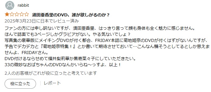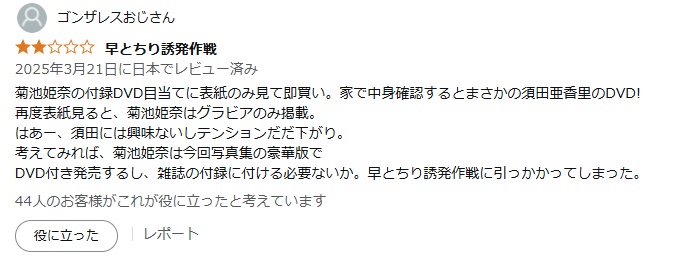 菊地姫奈のDVDと思って購入した人が、実際には須田亜香里のDVDだったと勘違いし苦情が殺到。本人は無関係なのに叩かれてしまう事態に。