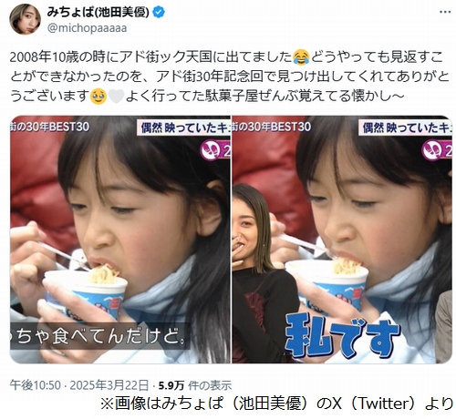 タレントの“みちょぱ”こと池田美優(26歳)が、3月22日に放送されたバラエティ番組「出没!アド街ック天国」(テレビ東京系)に出演。2008年に同番組が撮影した「ブタメンを食べる女の子」について、「私です(笑)。恥ずかしい」と語った。