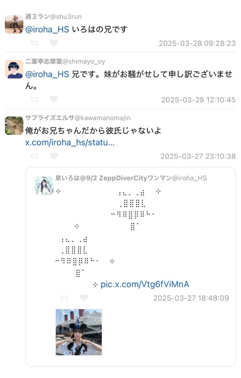 アイドル・泉いろはが投稿したディズニー写真に“男の姿”が映り炎上。本人は「兄です」と釈明し証拠画像を公開。ネットでは“苦しすぎる”と話題に。