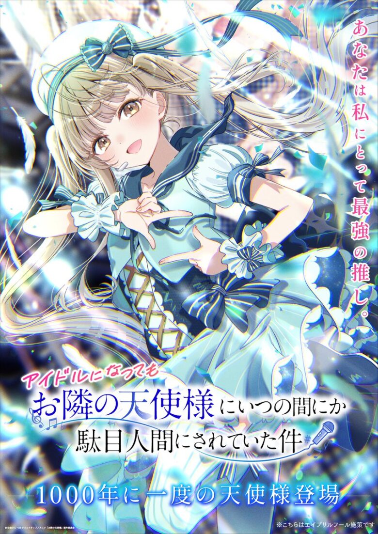 小説投稿サイト「小説家になろう」などで人気のライトノベルが原作のテレビアニメ「お隣の天使様にいつの間にか駄目人間にされていた件」のエープリルフール企画として、ヒロインの“学校一の美少女”椎名真昼がアイドルになったビジュアルが公開された。アニメ「【推しの子】」のキャラクターデザインの平山寛菜さんが描き下ろしたビジュアルとなっている。