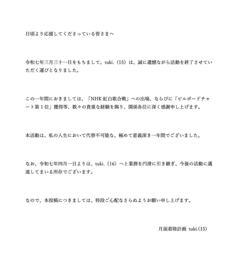 昨年のNHK紅白歌合戦に初出場した高校生のシンガー・ソングライターtuki.(15)が31日に自身のインスタグラムを更新し、今月いっぱいで“活動終了”することを報告。4月以降はtuki.(16)へ業務を引き継ぐことを発表した。