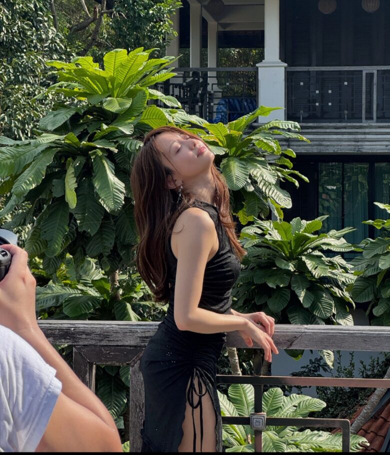 浜辺ではしゃぐ様子や、美脚があらわになったタイトな黒いドレス姿の写真も投稿。