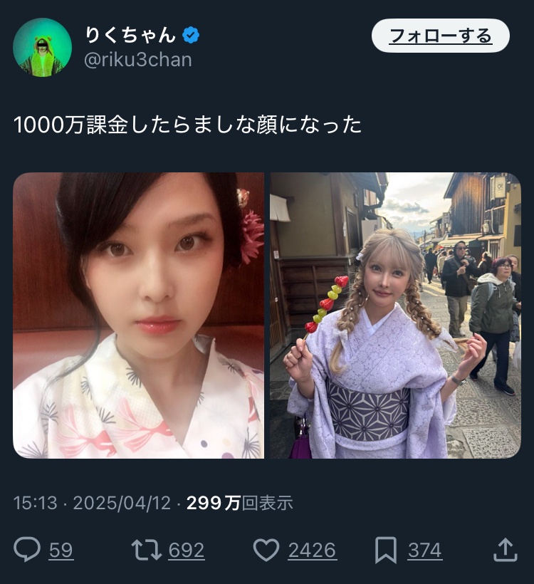 YouTuberのりくちゃんが「整形に1000万課金した」とSNSで明かし、15歳と24歳の比較写真を公開。ネットで賛否両論が巻き起こる。