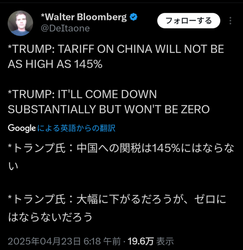 【速報】🇺🇸トランプ大統領「対中関税は145%にはせず、大幅引き下げへ──ただし撤廃せず」
