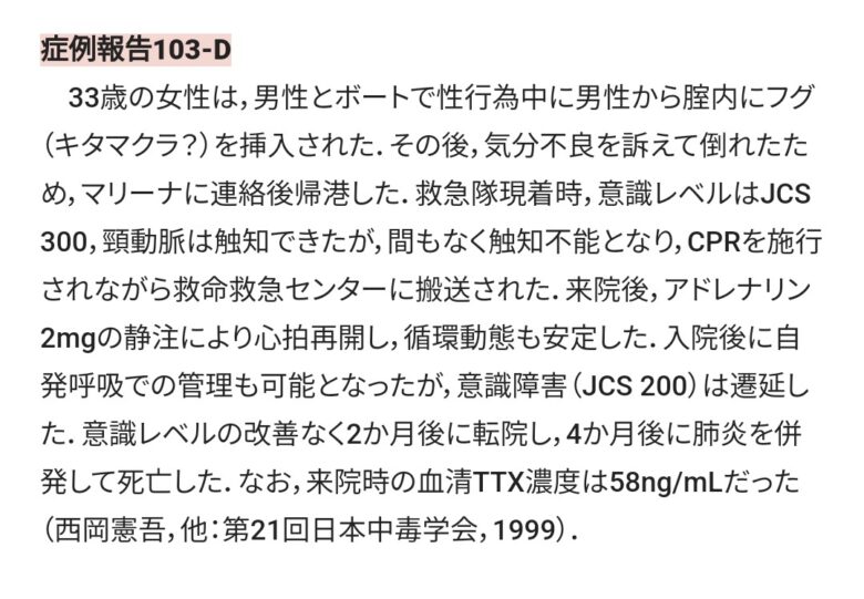性行為中に男性から膣にフグを挿入された女性が中毒症状を起こし死亡。血清から高濃度のテトロドトキシンが検出された。