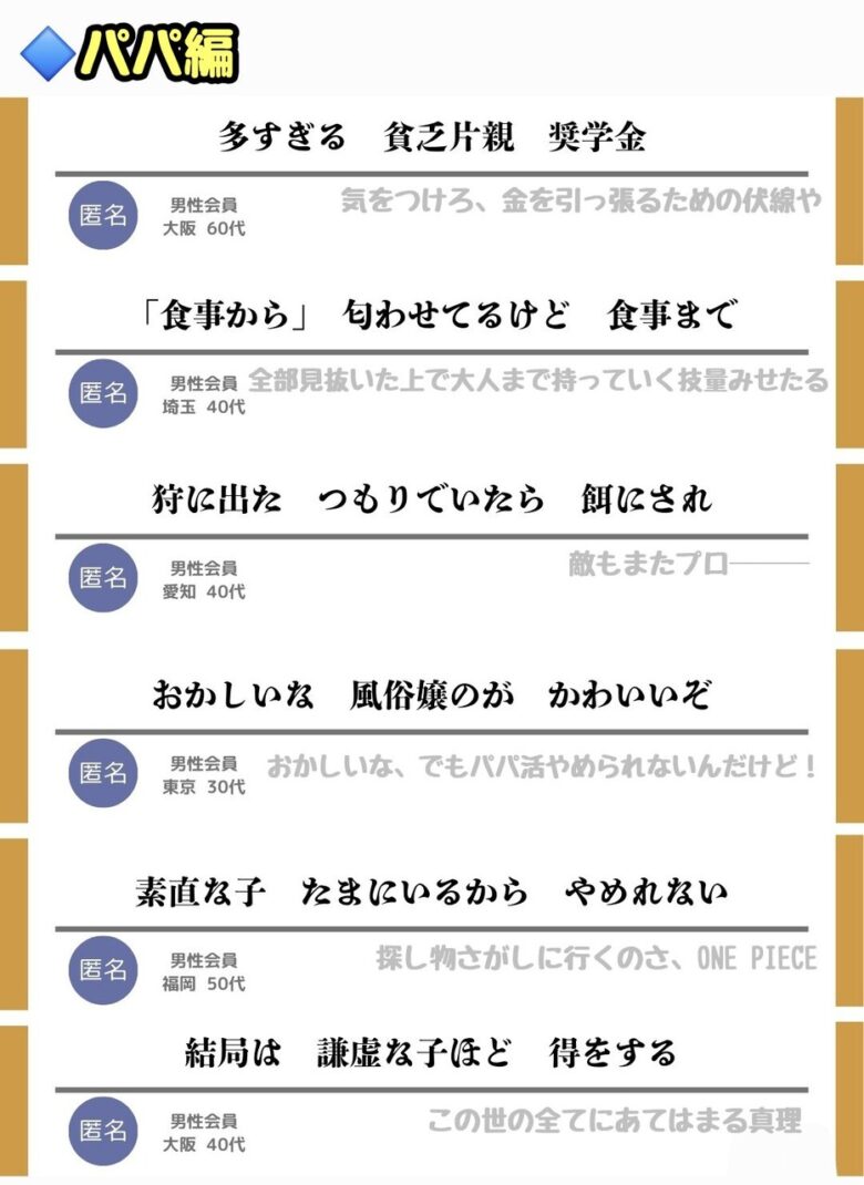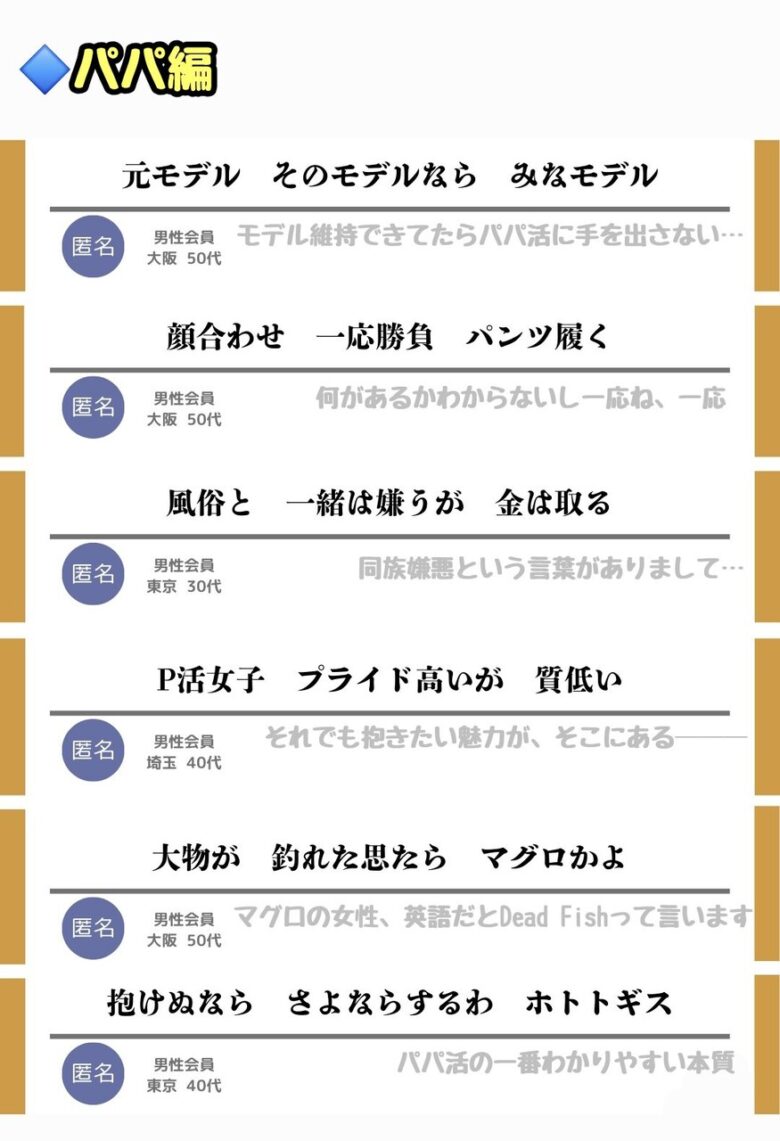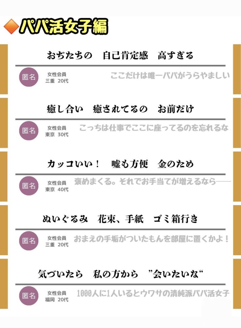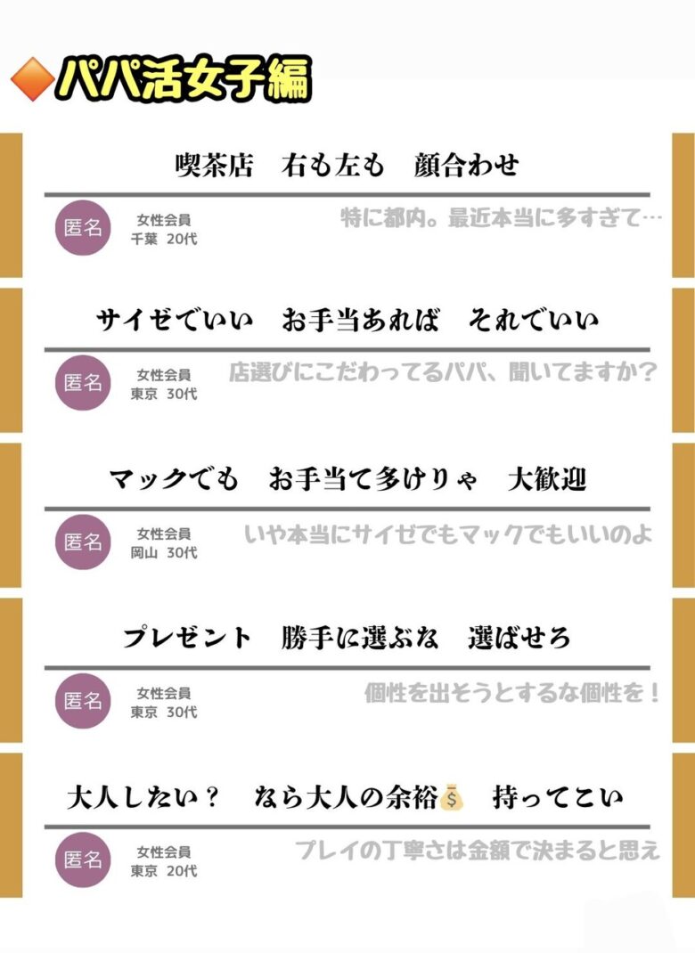 パパ活女子の最新料金表が拡散。食事だけで15万円要求も。川柳ややり取りも話題に。ドカタの意味に困惑する声も。