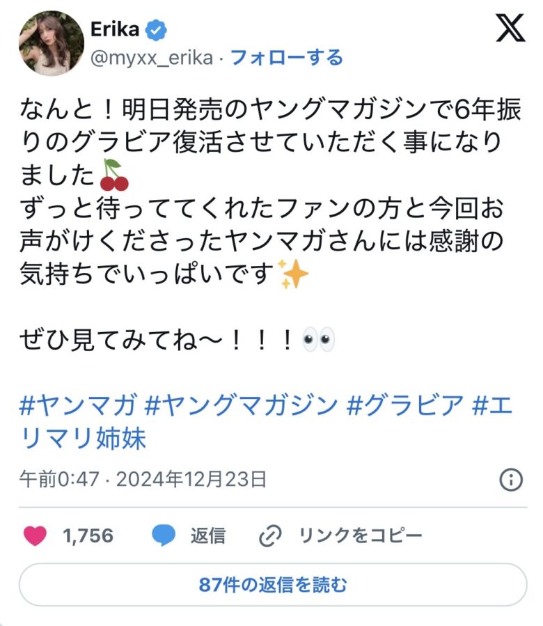 かつて「性的搾取」と炎上した姉妹グラドル・エリマリがグラビア復帰。大胆な姿にネットがザワつく。