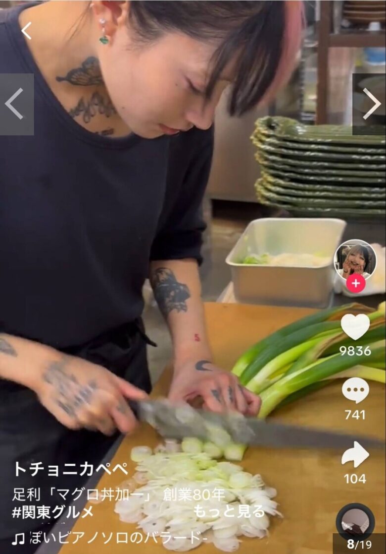 清潔感のあるタトゥーの入った美しい女性店員が手際よく調理をしている映像が4月末にネットで拡散された。関東のグルメを紹介するTikTokerの投稿したものだが、Xの一部ユーザーからは「残念ながらスミがきざまれた店員がいる店には行かないと決めている」との意見表明がなされ、大きな話題となった。