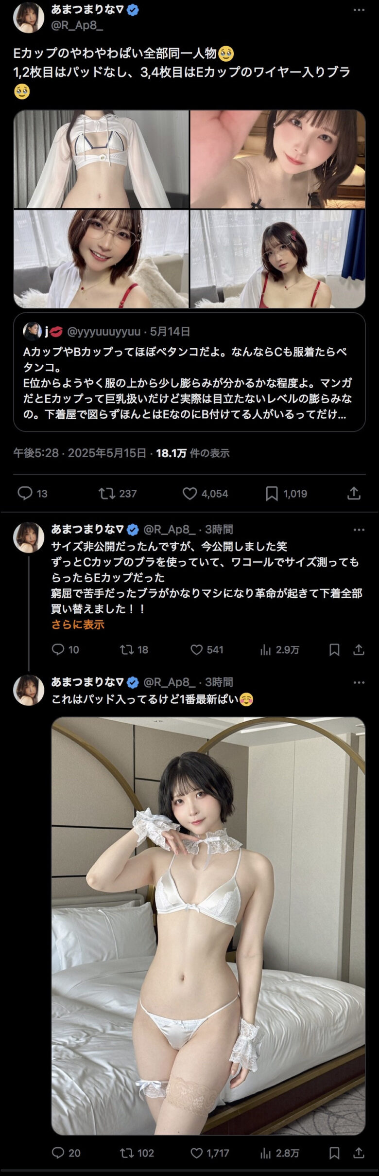 画像に映る「Eカップ」にネット騒然。「思ったより小さい」「くびれと腰が凄い」と賛否両論が巻き起こる。