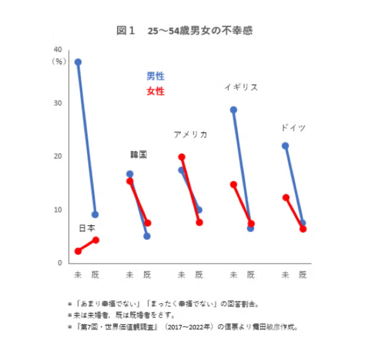 日本の女性だけが結婚した方が独身の時より幸福じゃなくなってるの草