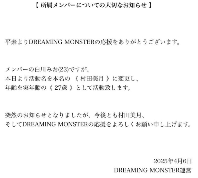 公式Xでは「所属メンバーについての大切なお知らせ」と題して文書を公開。「メンバーの白川みお(23)ですが、本日より活動名を本名の《村田美月》に変更し、年齢を実年齢の《27歳》として活動致します」と発表した。