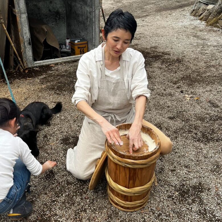 「味噌作りも毎年この季節の恒例行事」として、屋外で味噌桶をいじる姿を公開したのは小島聖。「一年八ヶ岳の風に吹かれて発酵、熟成する 開封が楽しみ」とつづり、ショートヘアの黒髪でエプロン姿の自然体の姿を紹介している。