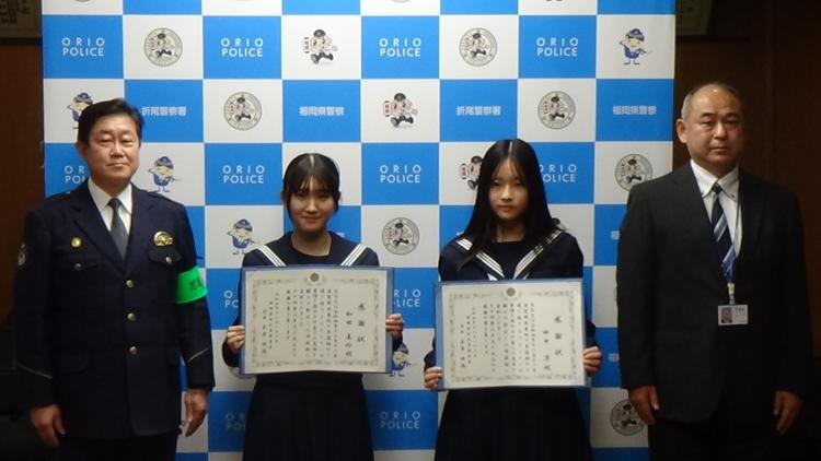感謝状が贈られたのは遠賀中学校2年の田中凛さん(13)と和田美玲さん(14)です。