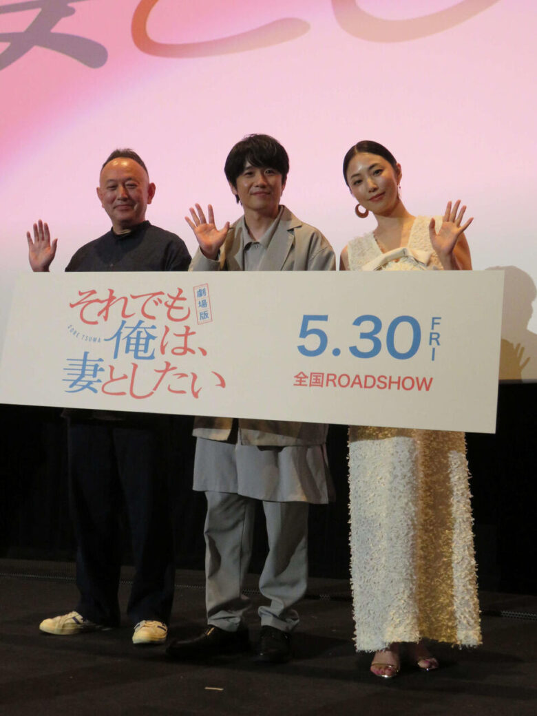 「劇場版 それでも俺は、妻としたい」完成披露上映会に登壇した、左から足立紳監督、風間俊介、MEGUMI(撮影・村上幸将)